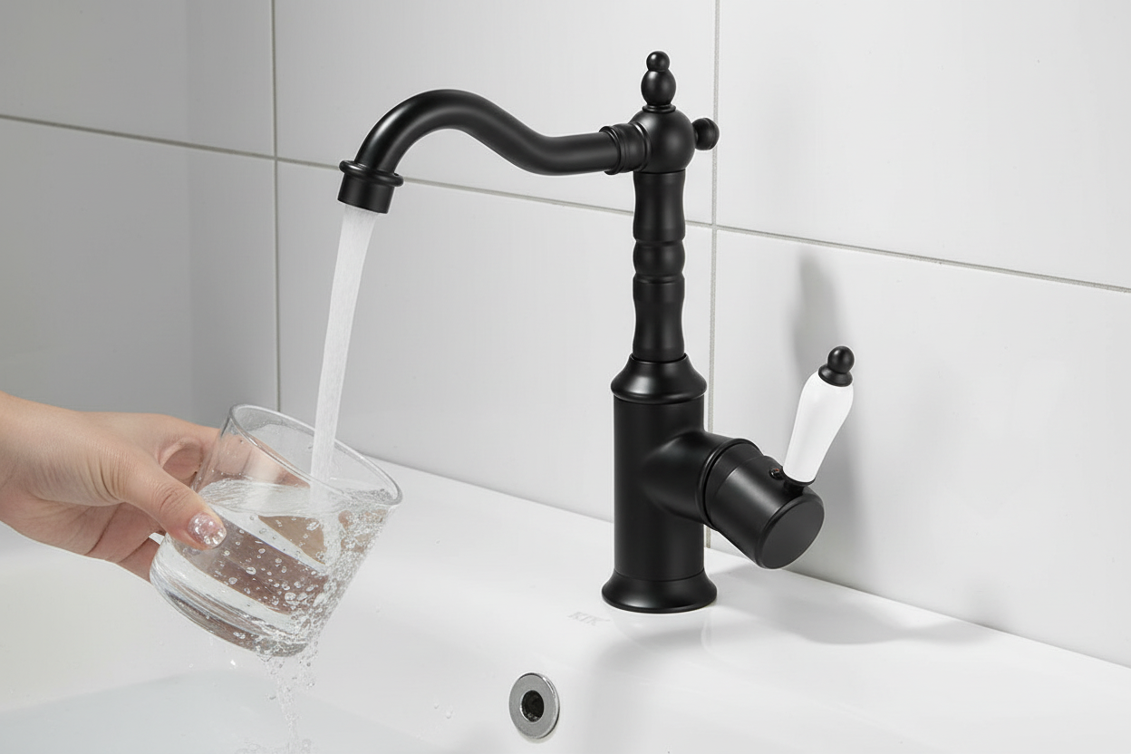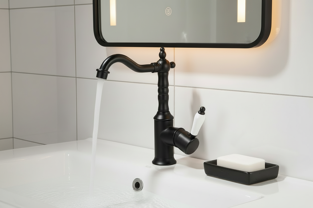 Bestel vandaag nog en geef je badkamer of keuken een stijlvolle, klassieke upgrade met deze zwarte wastafelkraan.