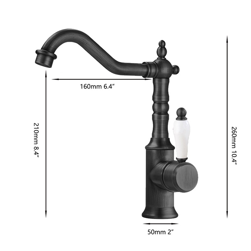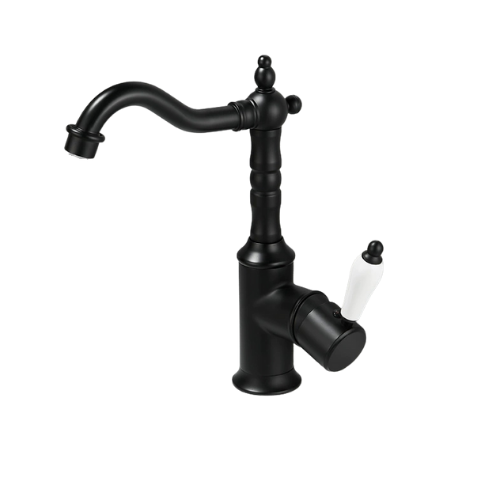 Deze klassieke wastafelkraan in zwart geeft de badkamer of keuken een elegante, tijdloze uitstraling. De sierlijke uitloop, verfijnde details en de porseleinen hendel zorgen voor een authentieke landelijke stijl met een luxe afwerking.